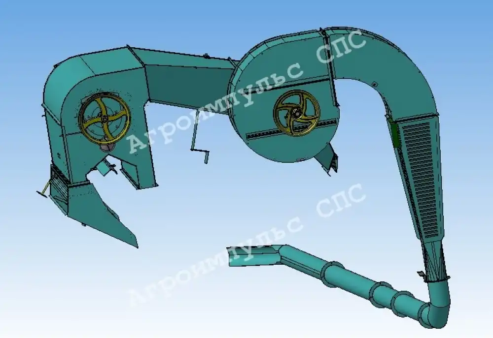 Вентилятор - пылевой, среднего давления, лопастный. Выходная часть оформлена в виде фланца. Переходник - прямоугольного сечения с фланцевыми креплениями к вентилятору и инерционному пылеотделителю . Внутри у него имеется заслонка. Положение заслонки устанавливают перед работой машины согласно рекомендациям таблички, расположенной на кронштейне крепления рукоятки заслонки. Во время работы регулировка воздушного потока осуществляется перемещением заслонки рукояткой. Инерционный пылеотделитель  - жалюзийный. Предназначен для удаления значительной части отработанного воздуха без заметной потери напора. Он выводит через жалюзи часть воздуха, освобожденного от легких примесей, а оставшийся воздух транспортирует отходы, Пневмотранспортер служит для перемещения легких примесей в сторону от машины. Он представляет собой воздуховод круглого сечения, состоящий для удобства транспортировки из колена, двух труб и носка 4, соединенных между собой фланцами. Выход из пневмотранспортера заканчивается носком. При перевозках пневмотранспортер снимается и транспортируется припакованным к машине в разобранном виде.
