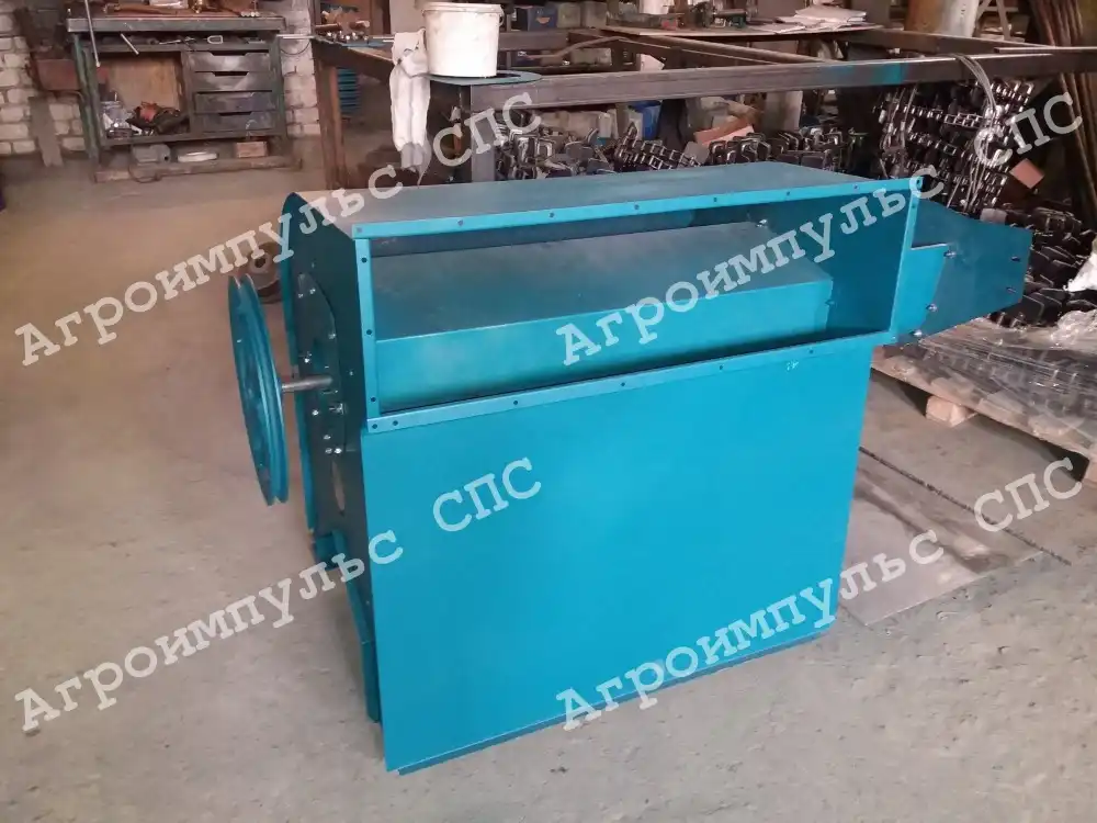 В корпус приемной камеры встроено питающее устройство, состоящее из кожуха шнека и клапана-питателя. Питающее устройство распределяет по ширине весь материал и состоит из сварного кожуха, приемного лотка, шнека, регулятора, клапана-питателя, торсиона. Торсион расположен в трубе клапана-питателя, являющейся осью клапана. Один конец торсиона закреплен в трубе, а другой выведен наружу к кронштейну, через который соединяется с тягой регулятором. Для мелкосеменных культур усилие поджатия клапана меньше, для зерновых – больше.