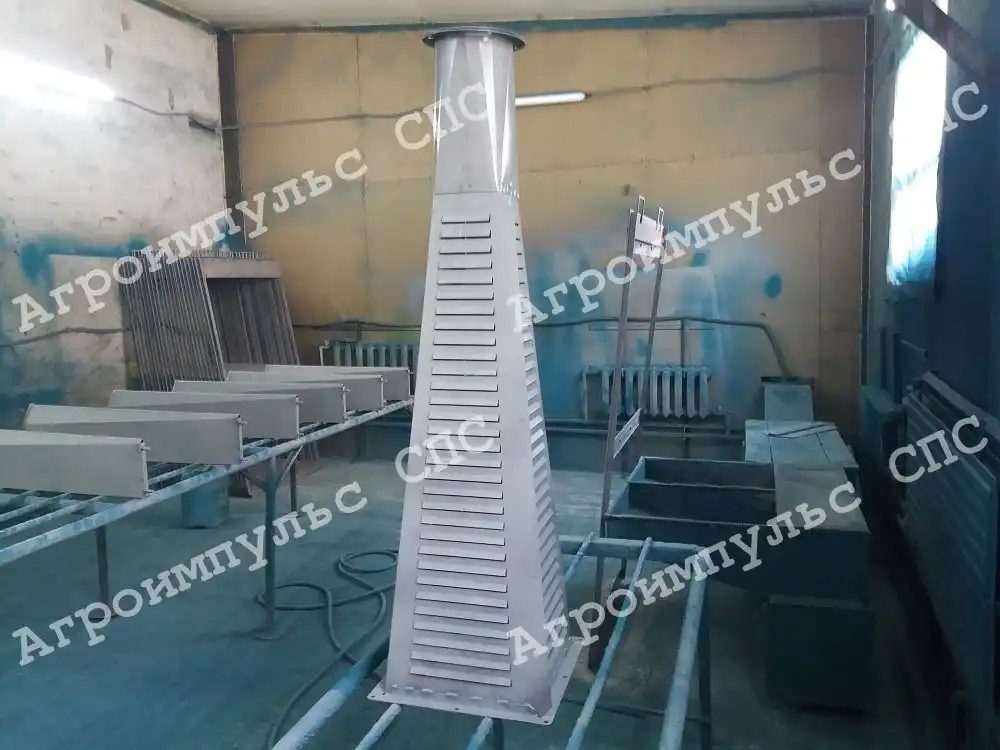 Имеет жалюзюйную просечку с четырех сторон для отбития легких примесей в выходящем воздушном потоке.